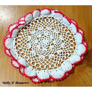 For your consideration are 5 lovely vintage crocheted white doilies (one with red trim).
