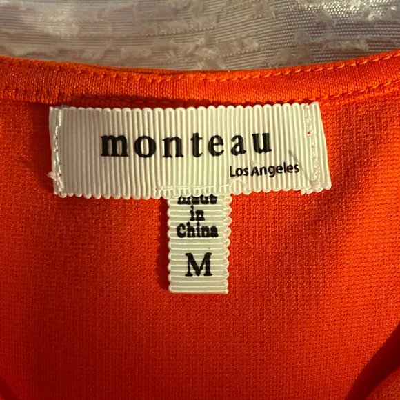 Monteau fit and flare dress, size medium, rayon/nylon/spandex mix of a heavyweight material with a nice stretch, color is deepest orange. Scalloped neckline and upper body is fully lined.