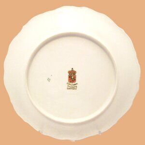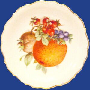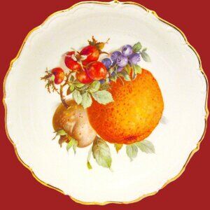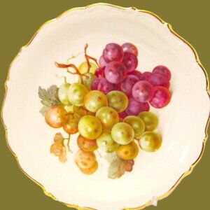 (5) Fruit Hand painted gold edged porcelain salad plates of Schumann Arzbery Germany (see pictures) circa 1940s of green pears, strawberry & purple grapes plate (it has a very small chip on back see pic of back of plate#7), (2) orange & grapes, plum plates (one orange & grapes plate has very small chip, see picture of back on #8), green & purple grapes plate, plums & red and white grapes plate. These are beautiful white porcelain 7.5" salad plates edged in gold. I will be selling all 5 as a set.