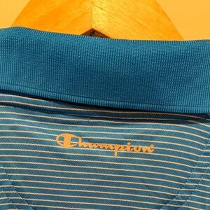 This men's Champion polo is perfect for the course! It features a bright blue striped pattern with a polo collar.