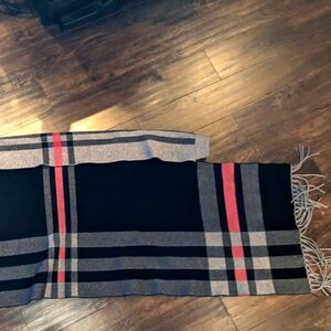 This scarf/shawl is super neat! It features a black, grey and red plaid that is reversed on the opposite side and is reversible. Made of a nice heavy stretch knit fabric with fringed ends.
