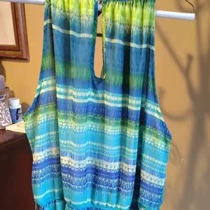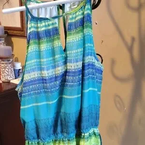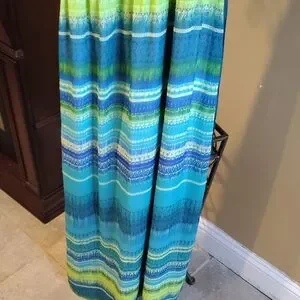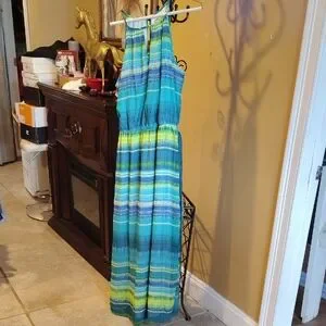 Vibrant blue and green striped maxi dress. Perfect for summer outings. Pre-owned but in great condition with a belt and elastic waist. Also has a keyhole front.
