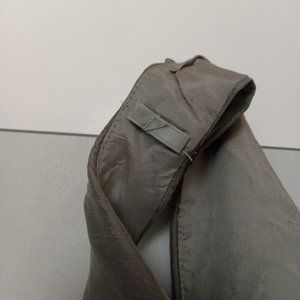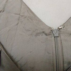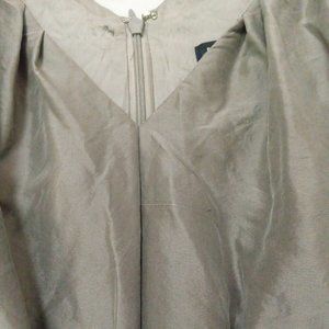 Beautiful Banana Republic grey silk dress. Full skirt, rouching on the side and lined. Zipper in the back and snaps to hold bra strap in place. Loved, but still in good condition. Minor signs of wear (see photos). Small tear in lining, not noticeable.