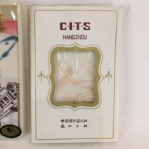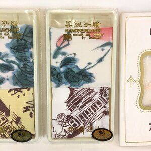 This is a lot of 5 handkerchiefs. All are new and still in the package. Two identical packages each contain two and there is one package of one. The two identical packages are hankies made of silk. One is floral and one features the image of a temple. The other is white cotton with an embroidered pink design. These may be from the 1940's.