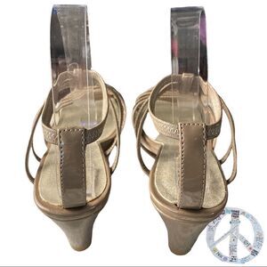 New York Transit. Taupe/Tan triple ankle strap with stretch & peep toe wedge heel. Patent & mesh. New