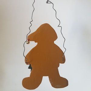 A vintage handmade wood and wire ornament of a gingerbread man with a hat and bow etc.