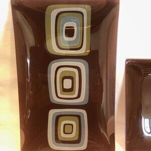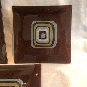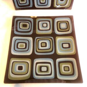 A set of two 12” Square Glass Platters, two 6 1/2 Square Plates and one 9 ¾ x 6 ¼ Rectangle plate. The pattern is a Mid Century Modern in style with Teal, Brown & Olive colors. These will make the perfect complement to your kitchen or dining room. They are cool and pretty enough that they would also look great on a plate hanger, as part of your wall art displays.
