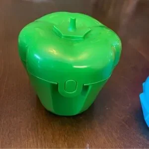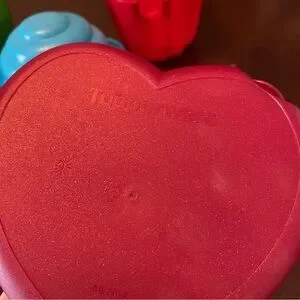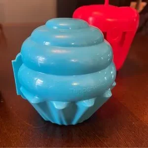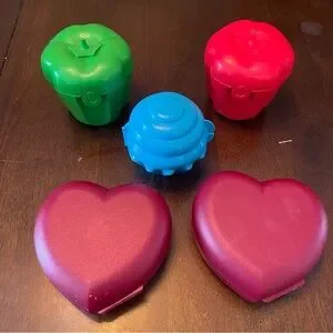 Vibrant Tupperware set with heart and cupcake shapes. Includes red, green, and blue containers. Ideal for fun and practical storage.