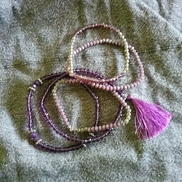 5 amethyst and lavender coloured glass and plastic bead stretch bracelets with silver tone hardware.