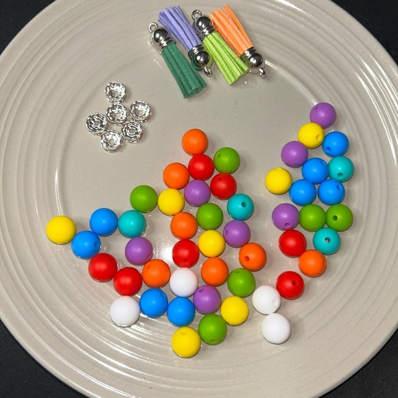 Brighten up your crafting with this colorful bead and tassel set. Perfect for crafting unique jewelry pieces. Includes vibrant beads in red, blue, green, yellow, purple, and white, along with playful tassels.