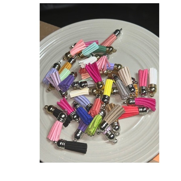 Colorful suede tassel charms with metal caps. Great for DIY bracelets, keychains, or bag tags.