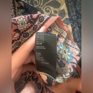 Embrace a bohemian vibe with this floral print V-neck blouse. Featuring a mix of aqua, pink, and navy colors, It tightens at the waist and doesn't really extend down to the hips. And you'll definitely need to wear a cami underneath because it's very low-cut (see last photo).