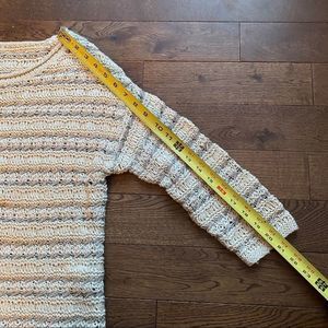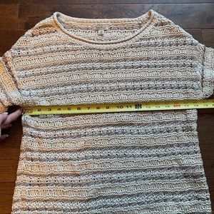 - Tan coloured knit shirt with some silver throughout. 3 quarter length sleeves