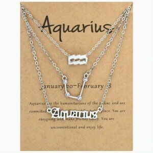 ~ 3-piece zodiac Aquarius link chain necklace set, featuring symbol, constellation and written zodiac.