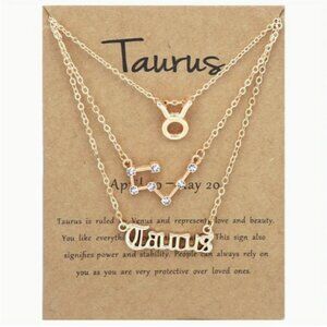 ~ 3-piece zodiac Taurus link chain necklace set, featuring symbol, constellation and written zodiac.