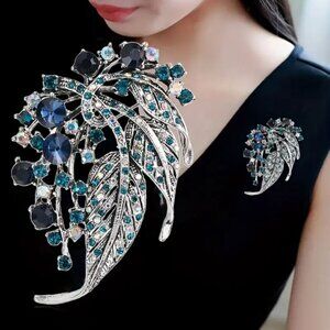 An elegant brooch featuring cut-out leaf design with faux blue crystals and rhinestones that give off blue/pink/purple sparkles in light.