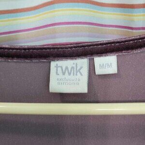 Beautyful shimmering lavender velvet midi dress with a wrap-around style bodice and 3/4 sleeves. The fabric has stretch and does not generate static electricity. Please note a small tear where I unstitched a staple (see last photo). I washed it several times and it never got worse.