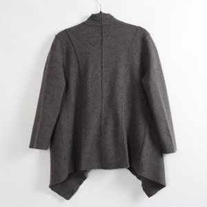 A gorgeous open front cardigan in a neutral taupe brown shade. Made from cozy wool material. Designed with a wide lapel, ¾ sleeves, raised stitch seams and two-point hemline. It’s also equipped with lined side slit pockets. Perfect for fall and winter. Great condition.