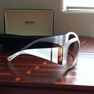 Authentic Hugo Boss sunglasses in a translucent white color (really cool) frame, gold hardware accents, brown fade lenses, orig case. Never worn.