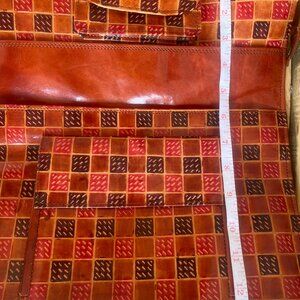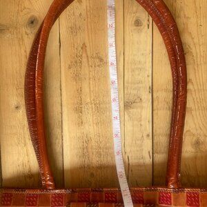 This genuine leather vintage mosaic tote is beautiful crafted in autumn red and plum purple. Sporting an extra long handle. That lifts the tote to feel secure under your arm and keeping access to it close by. It has two outter pockets. One for the obsolete tiny cellphones of the 90's, which can now be use for keys, lipstick or pocket change. Another larger one for the work parking pass.Clothing interior and working zipper enclousure.