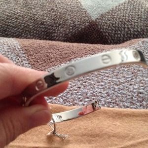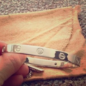 Similar to the love bracelet. Cubic stones alternate with screw-like design. Bangle bracelet opens by a clasp on one side. Nice solid weight! Never worn - ever! Perfect alone or stacked with other bracelets or your favorite watch!