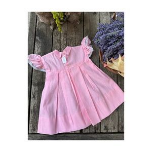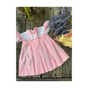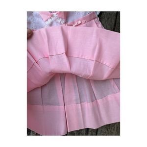 50s Baby Pink Fit & Flare Dress White Eyelet Lace Cap Flutter Sleeve Long Point