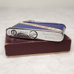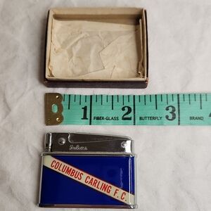 Stylish rectanglar 'Super DeLuxe' Automatic Lighter featuring "Columbus Carling FC" design. Red Blue and white colors with a sleek stainless steel finish.