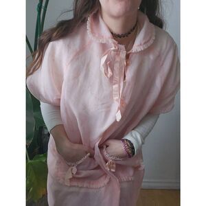 50s Vintage HouseCoat Duster Ruffle Floral Rhinestone Buttons Bow Robe