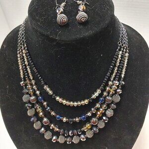 This Avon necklace and earrings set features a multi-strand chain design with blue and black crystal beads and a silver tone finish.