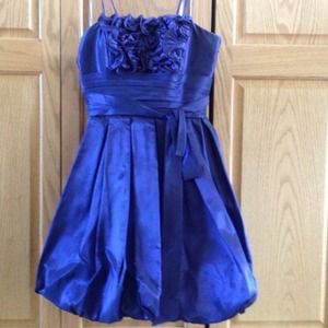 This dress is a very rich eggplant color though it looks blue in the photo. Can be worn strapless or with straps. Very fun and flirty. It needs to be steamed since it has been stored in a space bag.