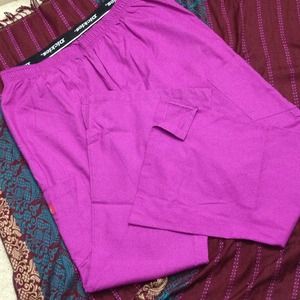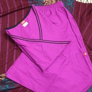 Clean and new. No stains or tears. Its color (Fuschia) is much richer than depicted in the pictures.. TOP- I may have worn once, can't remember. Has 2 side pockets. PANTS- never worn. Gartered waist. Side pockets on both legs. Flared bottom.