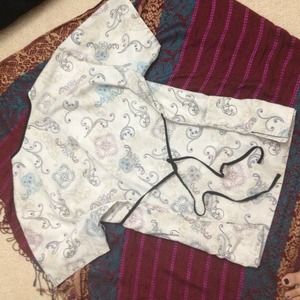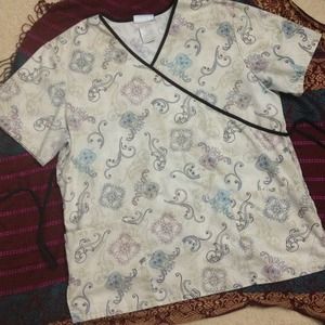 2 front pockets. Ties in the back. Beautiful design. No stains or rips. Soft and comfortable material. Match with black or brown bottoms. Ask about bundling with the other scrubs listed ;)