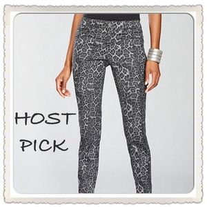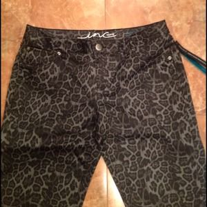 Brand new with tags. Cotton/Polyester/Spandex. Low rise 8". Skinny leg. Faux front off-seam pockets, patch pockets at back. Tonal animal print. Apprx insteam 32" long