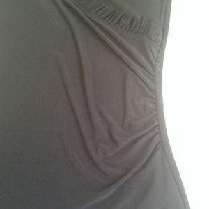 Polyester/spandex so it fits perfect with the stretch. Gathered on the left side with a ruffle trim around the neck.
