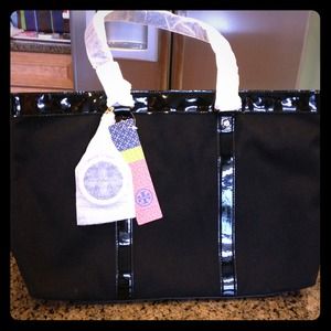 Never been used black canvas Jane Tote. Inside zip pocket and two accessory pockets. Gorgeous patent trim.