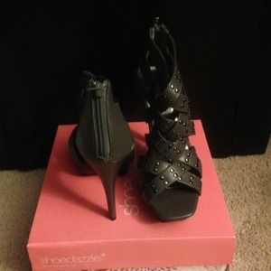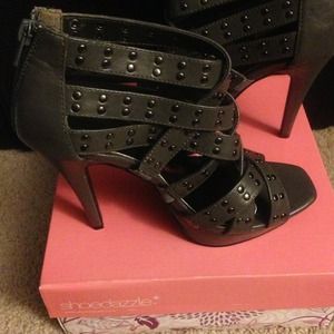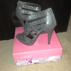Jessie is a fun heel that has never been worn! Jessie is a studded grey 4 inch heel with zippers in the back. These were purchased for a Vegas trip that didn't happen. This heel fits true to size and comes with the original box.