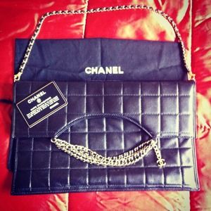 Authentic quilted black Chanel purse with gold chain straps. Unique and fashionable style. Can be worn two ways: over the shoulder or hand-held. Authenticity card and black cloth bag included. Only used once! Minor scratch marks on the inside.