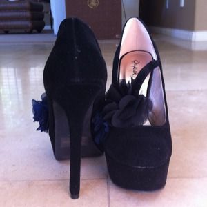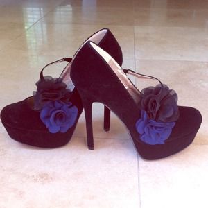 Never worn! Mary-Jane type heels with black and navy cloth flower embellishments.
