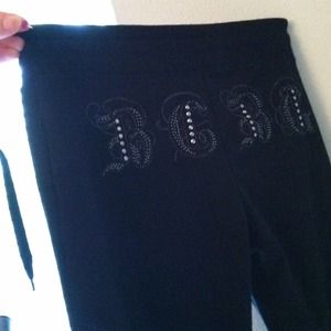 Very cute BCBG pants size S. Design on the outside of both legs. Also says "BCBG" across the rear. Perfect. The design is 100% intact. I'm 5'7 and these come to my ankles, just above touching the ground so if you're shorter these would be perfect. 95% cotton 5% spandex. Has drawstring waist