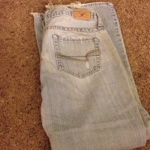 @haleylmay alright I just got home and looked. There's a frowny face drawn on one of the legs. But I do have another pair of hipster fit AE jeans. The only thing wrong with them is the fraying on the bottom like these cause I'm short. There's no stains or anything and they are a light wash just like this pair.