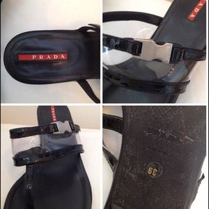 🌟REDUCED🌟 I love Prada's quirkiness and edge and Prada's Sport line mimics the main line but with sporty. This sandal is constructed from black patent leather. The instep strap has a clear/see through plastic strip. Decorative silvertone buckle with incised Prada logo. Rubber sole with tread. 1.5" Kitten heel. Of course, made in Italy. Brand new, never worn. Comes with dust bag. In excellent condition.