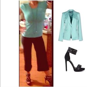 NEVER WORN. CAPRIS ARE BLACK WITH BLUE STRIPES. VERY CUTE FIT! CAPRI SAY 0, BUT I DO THINK THEY'LL FIT 2. 64% POLYESTER, 32% VISCOSE, 4% LYCRA