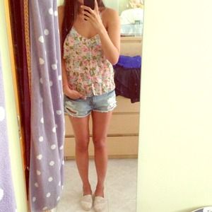 @gsgummybear includes the Abercrombie floral tank, navy peplum top, and sheer teal top