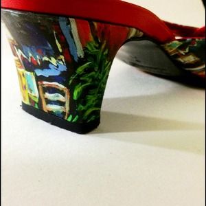 These limited edition shoes were purchased on a trip at a tiny boutique. I had to have them! Now because I have to make space in my closet I'm posting them -- buy now before I change my mind! The print features the romantic streets of Italy on soft leather. Even the heel is printed and the insole and lining is red glove leather. As with most designer shoes, these run a tad small. These shoes are like a work of art. Designer is Jeon. $85