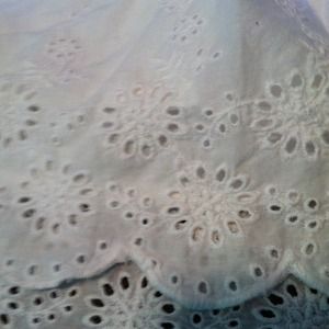 Flirty and girly white skirt! Has floral cute out along bottom to make it extra girly. The top is an elastic band and it fits flowy. Falls right below the knee another great skirt for a windy day!