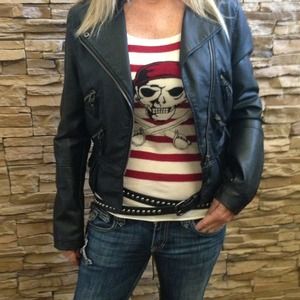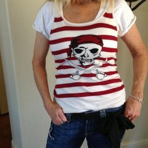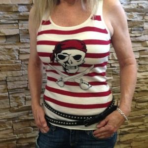 Cream and red striped cashmere/silk tank with pirate on front. Fun piece. Gardenia, CA based designer. Purchased from a great boutique in Rancho Mirage, CA