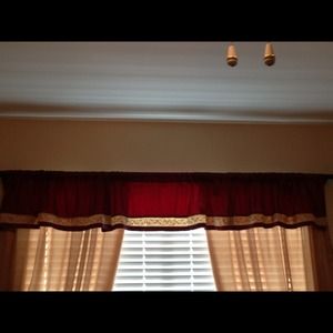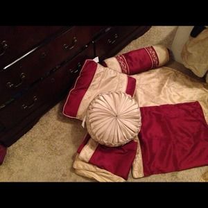 Includes comforter, 2 regular shams, 2 square shams, 3 accent pillows, matching throw, bedskirt and 4 valances. Few normal spots that would come out with a wash. I am doing our room in coke now, but I still love this set!
