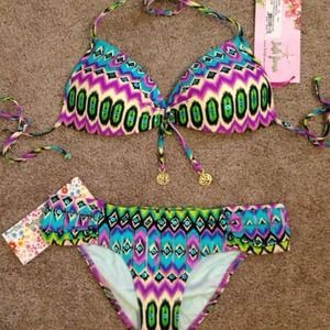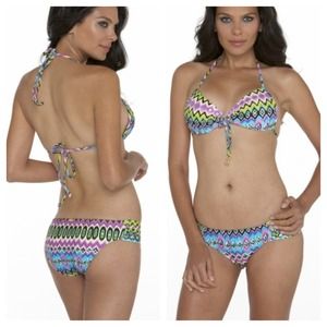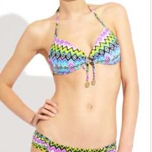 BNWT & hygienic liner attached! Sexy Playa Esmeralda Molded Push-Up Bandeau Halter in a size Medium features allover wavey print with sparkle accents throughout. Flattering pleating at center-bust with adjustable tie and gold-tone accents. Padded for a dramatic lift with self tie closures at neck and back. The Playa Esmeralda scrunch side bottom is an X-Small (but fits more like a small) and offers pleated panels on the hips with sexy, yet appropriate moderate back coverage.
