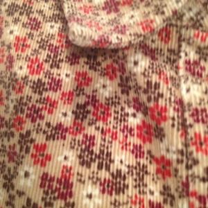 Women's quilted winter shirt with colors of orange, beige, and brown on a winter white background. Very warm
