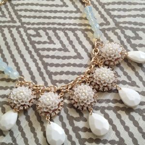 Add elegance and shine with this pretty statement necklace! With white flowers cut rounded by crystals and white faceted drops connected together on a gold tone chain.